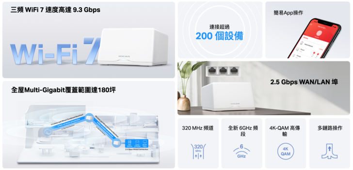 今天要開箱的是MERCUSYS公司出品的Halo H47BE BE9300 Wi-Fi7三頻 Mesh Wi-Fi分享器,它是屬於強調最新Wi-Fi7高速網路與Mesh大覆蓋率的高階機種,由下圖官網的說明所示,可以很清楚的的了解Halo H47BE的重點規格與功能,它強調三頻高達9.3Gbps的速度、180坪的大覆蓋範圍、提供高達200個以上同時連接使用的設備、320MHZ寬頻道的傳輸、Wi-Fi7 全新的6GHz頻段、2.5Gbps有WAN/LAN線連接埠,以及簡易的App操作等等,一目瞭然的重點有利於消費者了解它的適用性,下面就來讓我們來試用看看它的強悍在哪裡。