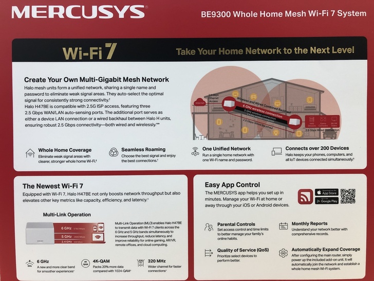 盒子背面三個區塊則是進一步說明它的適用情境、Wi-Fi7特有的MLO模式(Multi-Link Operation,這個非常有感,後面我們會再說明),以及一切透過APP輕鬆設定的方式,同樣是英文說明,不過由右上方的圖,一般人看圖也大致可以明白它涵蓋房子大範圍甚至跨樓層網路連線的超強能力。