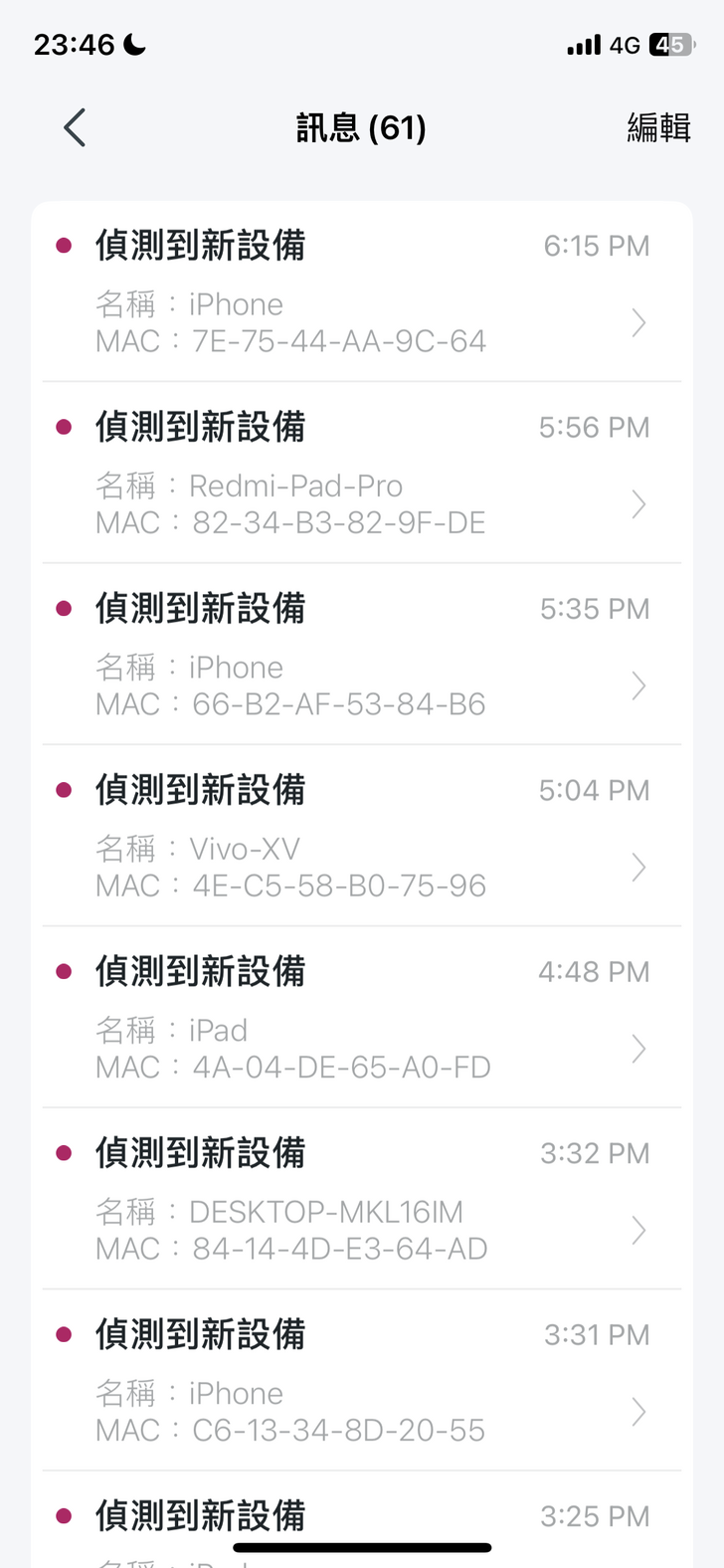 首頁右上方點選郵件圖示即會顯示系統通知您的訊息,通常只要有新裝置連線到你的H47BE分享器,手機都會跳通知通知您,並且會將訊息新增到訊息頁面裡供你查閱。