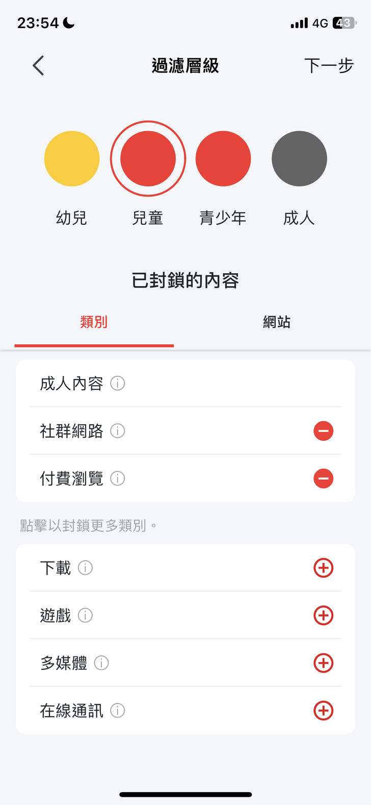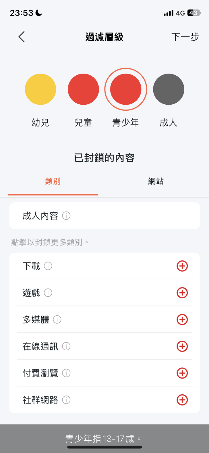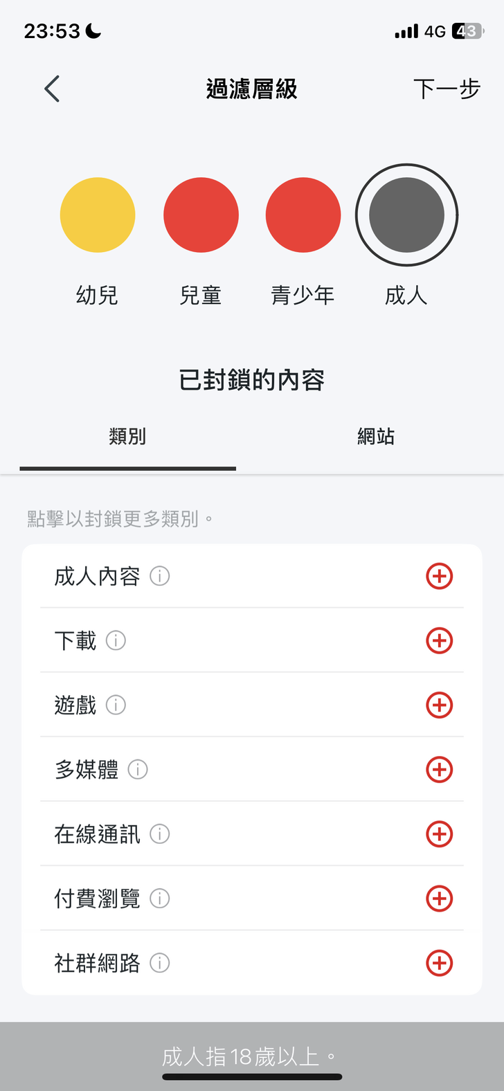 然後選擇過濾層級 (管制對象的類型),如『成人』預設是沒有『已封鎖的內容』,幼兒是全部封鎖,兒童與青少年預設的封鎖內容是『成人內容』。