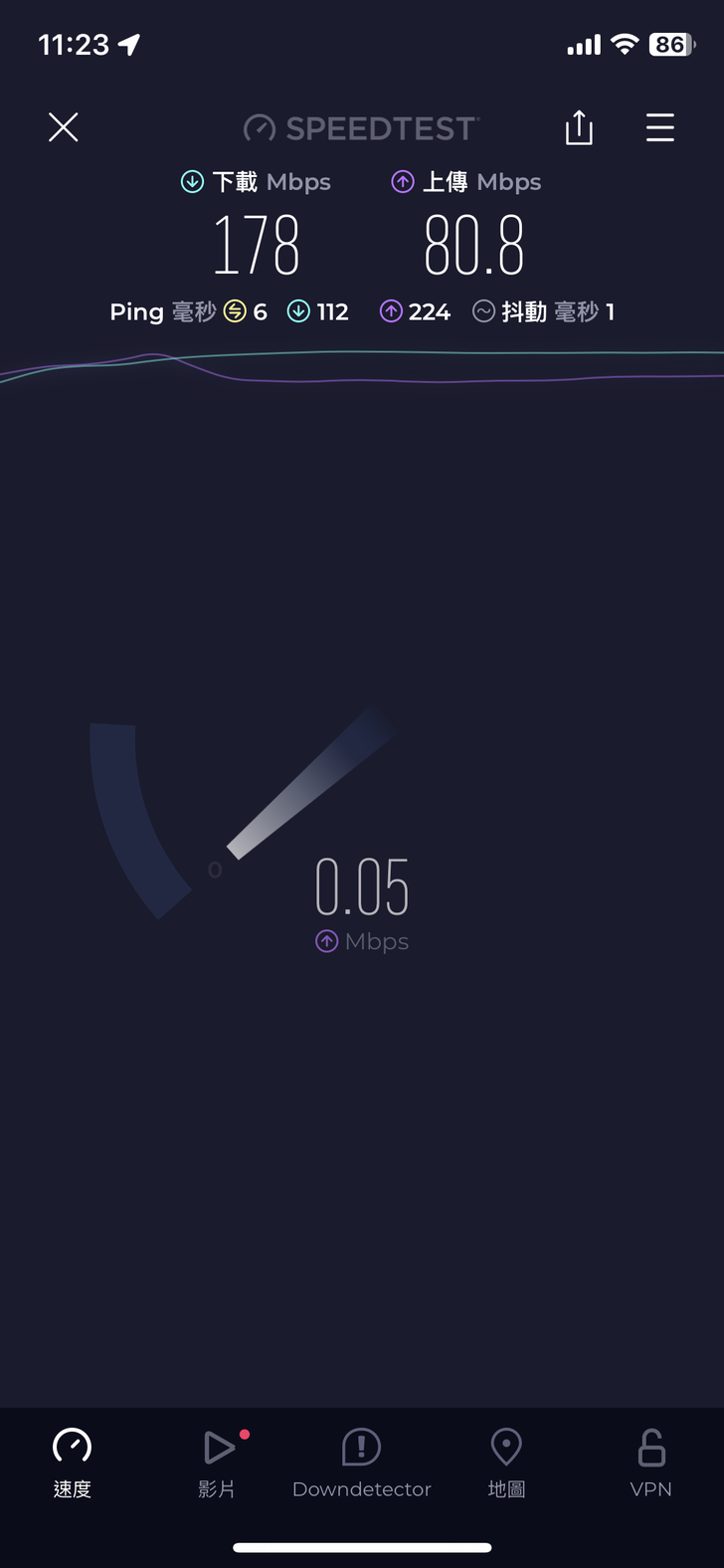 與Halo H47BE的位置距離最遠且隔了更多面水泥牆,速度來到下載178Mbps 上傳80Mbps,雖然看似降了不少,但是中間隔著這麼多面牆,若是其他等級的基地台早已無訊號了,更何況這樣的速度其實還是非常快的。