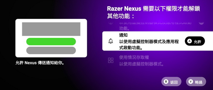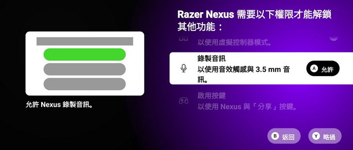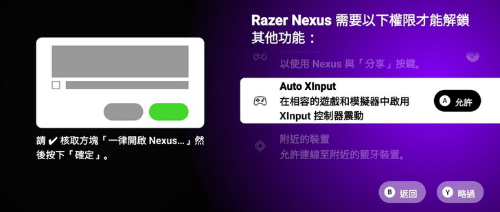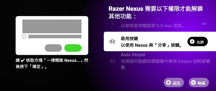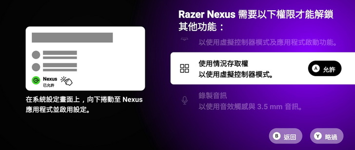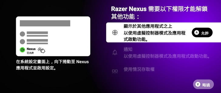 ▼ 程式介面會告知需要允許的權限跟步驟教學,只要按下按鍵A,就可以開啟選單解鎖 Razer Nexus 功能。