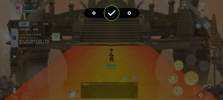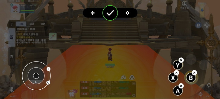 ▼ 在遊戲畫面中央的上方,會看到一個懸浮半圓形,點擊下去就可以看到虛擬控制器的按鍵選單。