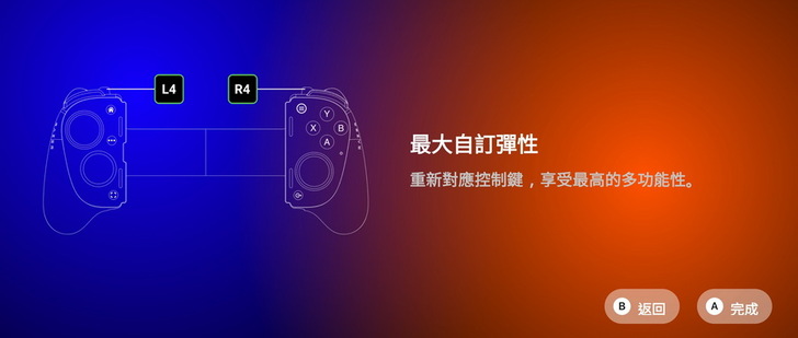 ▼ 左右兩邊的頂部為 全尺寸霍爾效應發射鍵 L1/L2/L4 與 R1/R2/R4,L4、R4 為多功能自訂鍵。