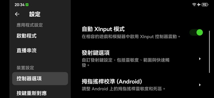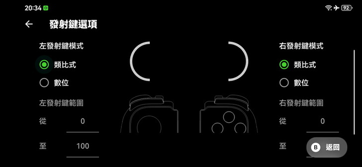 ▼ 控制器選項 可以詳細設定兩邊 上方發射鍵、類比拇指搖桿 靈敏度、觸發、範圍。