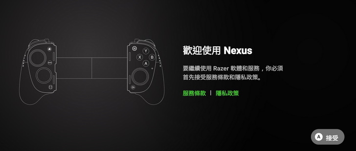 ▼ 執行 Razer Nexus App 最先要接受的就是同意條款,透過Razer自家這個免費App,就能探索iOS和安卓數千種遊戲,還能調整搖桿設定。