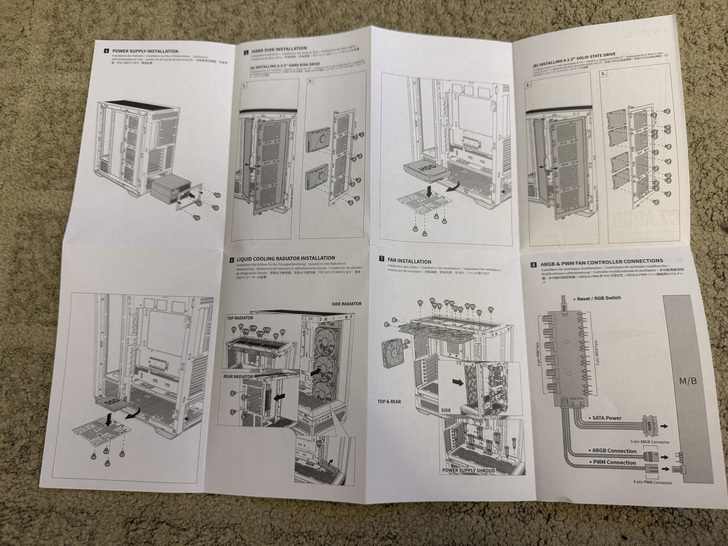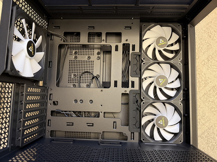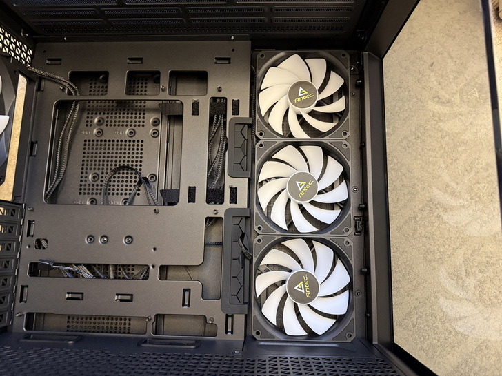 拆開後就可以看到整個機殼內部,預設就裝好了3顆12公分的ARGB風扇,這邊也可以拆換成360水冷排,只是看介紹要注意最寬7公分就是了