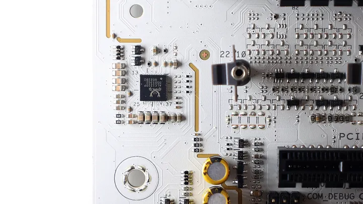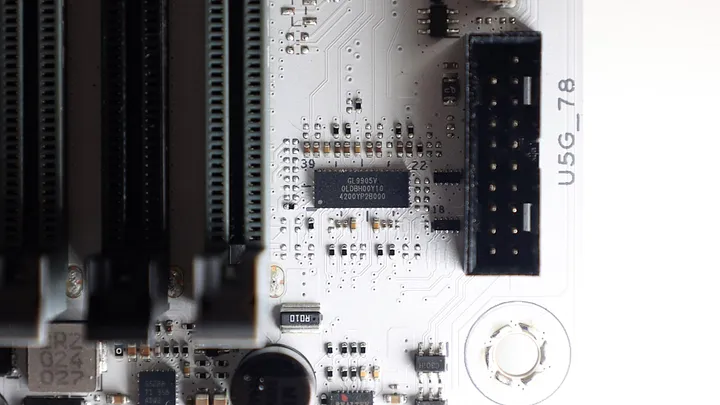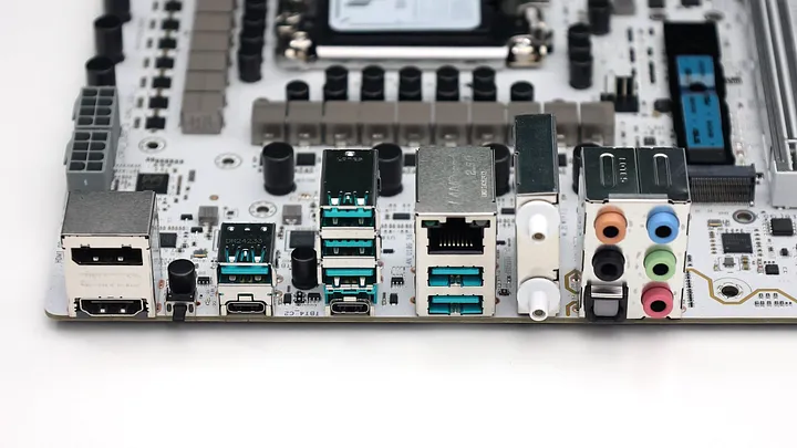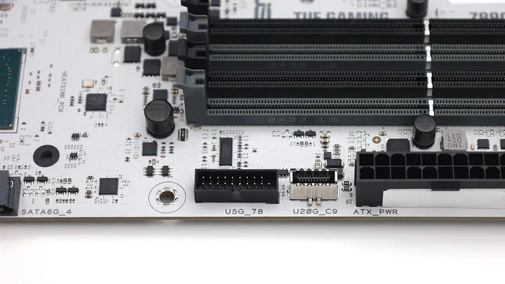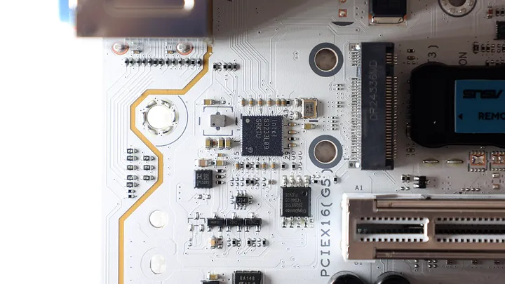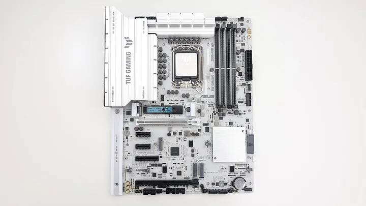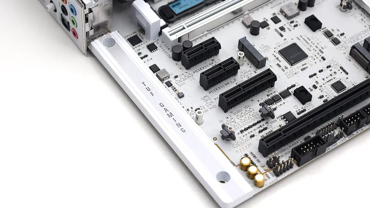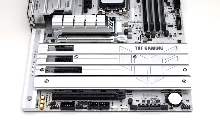 卸下所有散熱片和裝飾片後,可以看到整個主機板的主要零件。也可以看到主機板本身白色程度滿高的。第一條 PCIe x16 也用了白色的 slot,也加上了SafeSlot 的金屬加強堅固性。並具備 PCIe Slot Q-Release Slim 的功能,讓玩家不用依靠實體按鍵來卸除顯卡,只要拆下顯卡時稍微向 PCIe slot 的右邊傾斜,就可以自動解開卡扣、拿出顯卡,更為便利快速。