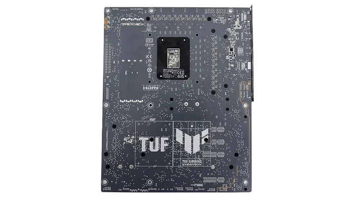 ASUS TUF GAMING Z890-PRO WIFI 的背面是黑色為主,並印有 TUF GAMING 的 Logo。