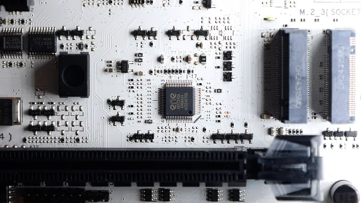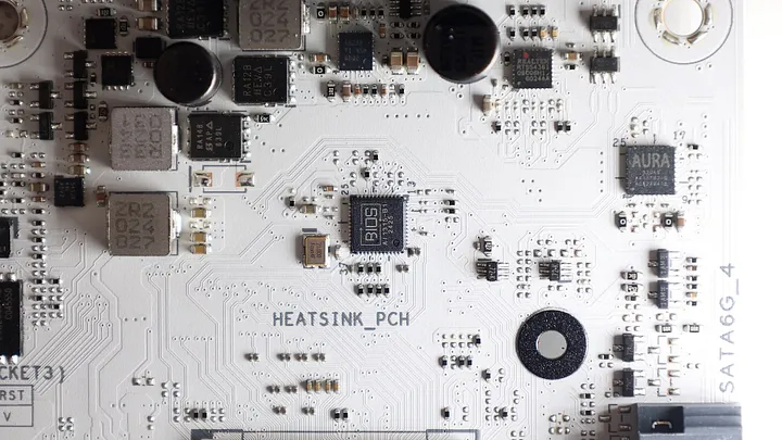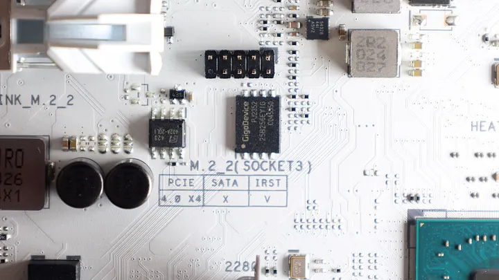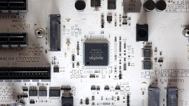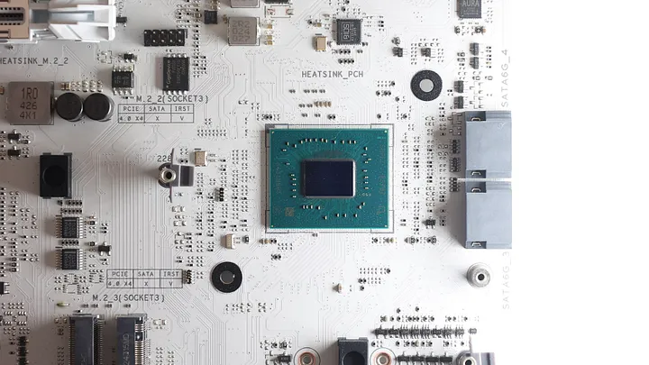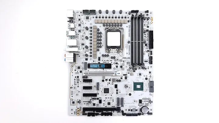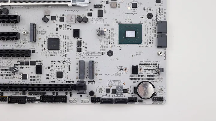 拆掉下方 M.2 散熱片後,可以更完整地看到,主機板表面也是灰白色的設計,這個灰白色整體偏向白一些,沒那麼灰,但也不算純白色。