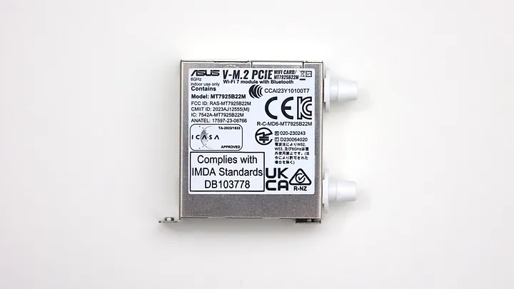 網卡部分外殼可以看到 ASUS V-M.2 PCIe WiFi Card / MT7925B22M,為 WiFi 7 網卡。Q-Antenna 的接頭設計,也讓天線安裝時更方便,不用一直轉螺絲。