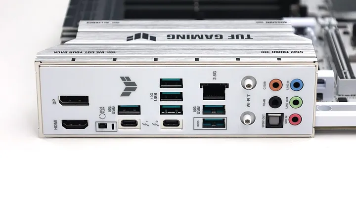 I/O 部分,影像輸出有 HDMI 支援 HDMI 2.1 4K@60Hz,DisplayPort 則是 DisplayPort 1.4 4K@60。一個 BIOS FlashBack 按鈕。兩個 USB-C 為 Thunderbolt 4。六個 USB-A 全部是 USB3.2 Gen2 10Gbps,其中一個支援 BIOS。網路部分則是一個 2.5GbE,和內建 WiFi 7 延伸出來的天線接孔。音訊部分則有 S/PDIF 光纖輸出以及五個 3.5mm 音訊接孔。