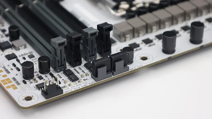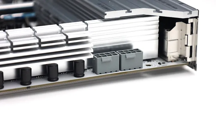 CPU 供電的輸入部分有兩個 8 pin 接頭,使用了灰色的 slot,周圍散熱片也很好地避讓,安裝上不會卡到手。