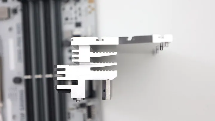 下方 M.2 散熱片區域從畫面上看來是切成四條,但其實只有兩片散熱片。上面三條是同屬一片的,最下面一條獨立一片。安裝和拆卸上沒有先後順序之分,可以獨立操作。