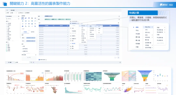 快速計算功能:可通過簡易操作完成基礎指標計算,如求和、同比、環比等。