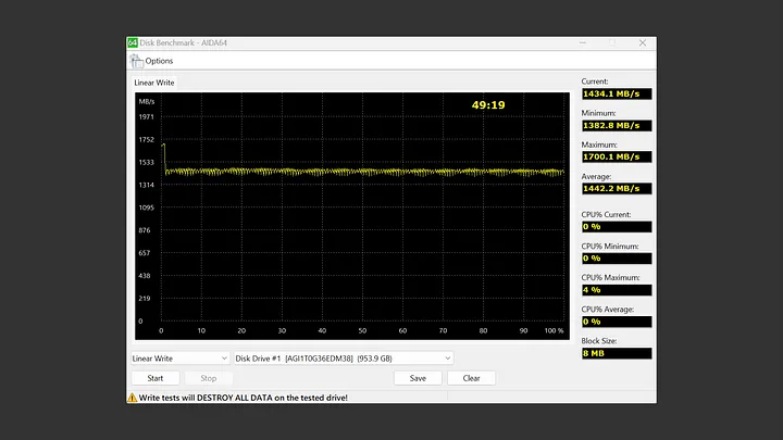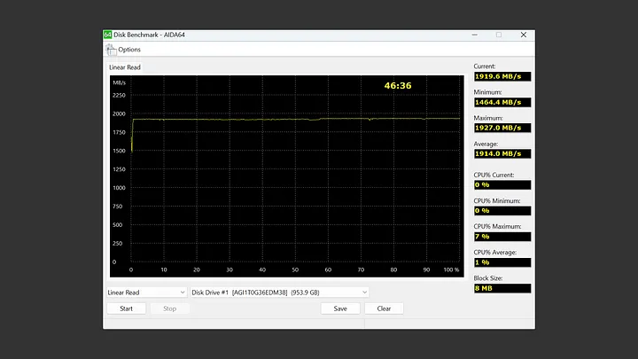 在 AIDA64 Disk Benchmark 中的 Linear Read,Block Size 為 8MB。除了開頭速度還沒拉起來,後面都是平直一條線維持在 1,900MB/s 左右。最終平均為 1,914MB/s,表現相當不錯。
