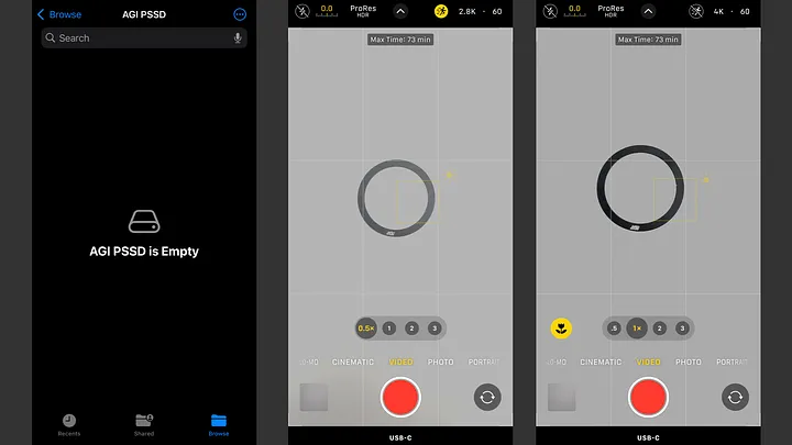 在 iPhone 15 Pro 上使用 PSSD,可以透過 iOS 內建的「File」以檔案管理的角度,查看編輯 SSD 中的資料。如圖左,其已經有辨識並進入到 SSD 中,顯示「AGI PSSD is Empty」。圖中與圖右,則是在 iOS 內建的相機,在英文介面中名稱是「Camera」,當錄製到外接裝置時,底部會冒出 USB-C 的字樣。當 ProRess 開啟並選擇 Action Mode 時,最高只能錄製 2.8K 60Hz。關閉 Action Mode 解析度就可以選到 4K 60Hz。