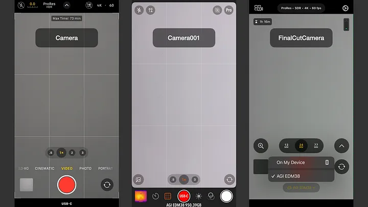 如圖左的 iOS 內建「Camera」,顯示容量最大可錄製時間 73 分鐘,實測以畫面變化的場景拍攝,達到 80 分鐘,平均位元率為 1.69Gbps。電量則從 100% 掉到 33%。比較討厭的是,只有當錄製 ProRes 4K 60Hz 規格時才能啟用儲存到外接的功能,使用相當受限。中間這款 App 是「Camera001」,接上外接裝置,會在下方看到裝置名稱及容量。最右邊則是 Final Cut Camera,是 Apple 的親兒子,透過下方的按鈕,可以切換儲存的位置。以上三款初步測試都能搭配 AGI EDM38 拍攝,有所限制的部分,大多是手機或 App 本身的限制。例如 EDM38 官網標示可以支援 ProRes 4K 120Hz 的拍攝,主要礙於我們使用的是 iPhone 15 Pro 系列,最高只支援到 ProRes 4K 60Hz,因此沒有測試這個條件。