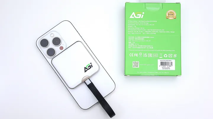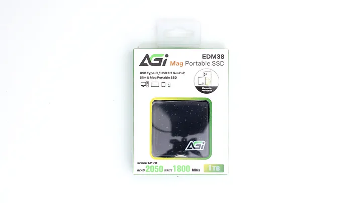 先前有開箱過 AGI 的 AI218 4TB,目前主要是裝在外接盒當外接 SSD 使用。而最近又看到 AGI 推出了具有磁吸功能的外接 SSD,看來也是想主打 iPhone 外接錄影使用的功能,便嘗試用用看。EDM38 包裝如 AGI 往常的產品相同,正面白色設計,盒子其他五面則是 AGI 的綠色。標示規格為 USB3.2 Gen2 x2,能達到讀取 2,050MB/s、寫入 1,800MB/s。
