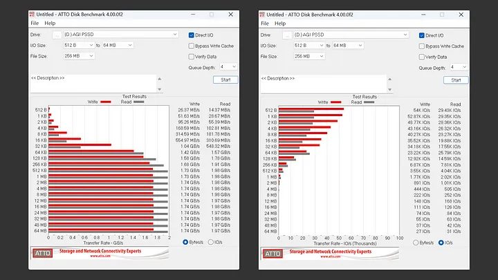 在 ATTO Disk Benchmark 中,讀取大概都接近 2GB/s,寫入則大約在 1.74GB/s 之間。