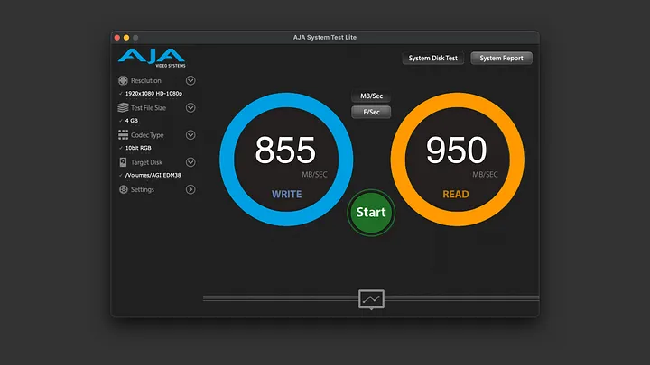 接著以 AJA System Test Lite 測試,檔案大小設為 4GB。寫入 855MB/s,讀取 950MB/s。