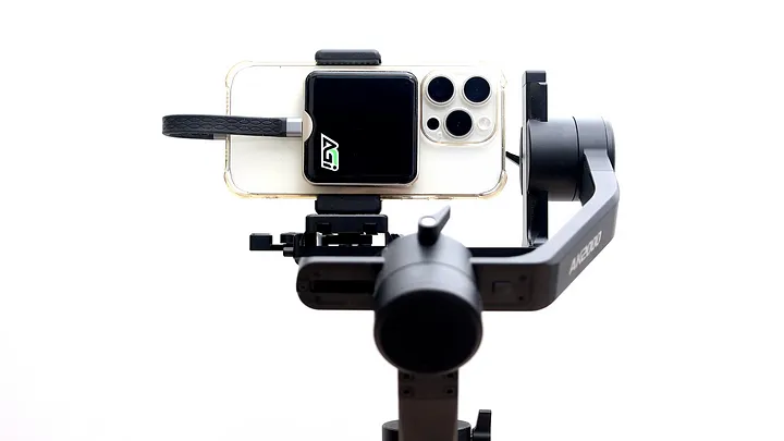 因為手上沒有 iPhone 15 Pro 的兔籠,而 EDM38 又需要藉由手機背後的磁吸固定。因此將夾具反著用,固定是沒問題,就是會擋住中間螢幕,初步確認重量是否可行。穩定器使用的是 Feiyu AK2000。
