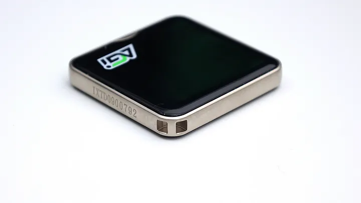 整體外殼是塑膠材質。黑色款的上下蓋都是黑色;白色款的上下蓋都是白色。黑、白兩色的中框都是淡淡金色,在塑膠材質上還是有做出質感。不過令人疑惑的是,為什麼要用雷射將產品序號打在這個中框上,而且還挺不小的,稍微降低了整體美感。一旁則有吊飾開孔,開的尺寸滿的大,如果是粗一點的線也可以穿過去,也算是多個保險,拍攝時可以多一個固定。