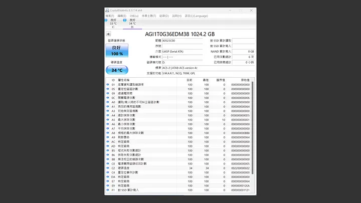 首先在 CrystalDiskInfo 中,可以看到 SSD 辨識出為 AGI1T0G36EDM38,容量 1024.2GB,韌體版本 X0523C00。