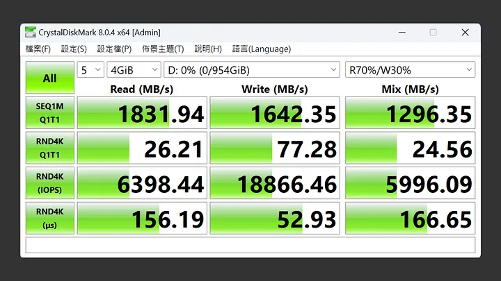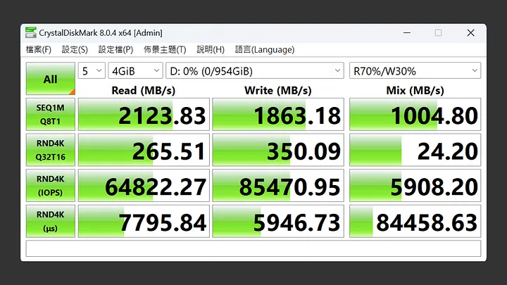 在 CrystalDiskMark 中,設定測試為五次 4GiB。最佳效能的設定下,循序讀取為 2,123MB/s,循序寫入速度也有 1,863MB/s。與產品包裝標示的讀取 2,050MB/s、寫入 1,800MB/s 差不多。混合讀寫速度則為 1,004MB/s,整體表現不錯。