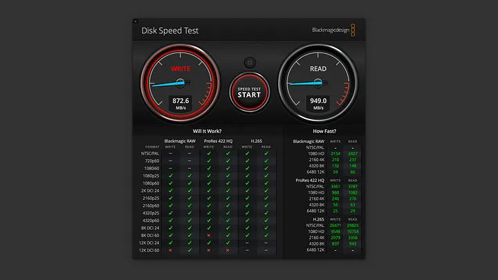 首先以 Blackmagic Disk Speed Test 測試,檔案大小 5GB。寫入 872.6MB/s,讀取 949.0MB/s,表現都符合這個規格的表現。