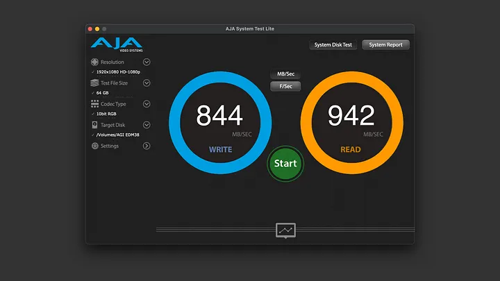 最後還是以 AJA System Test Lite 測試,檔案大小改為 64GB。寫入 844MB/s,讀取 942MB/s,雖然壓力加大不少,但依舊維持差不多的速度。整體表現 OK。