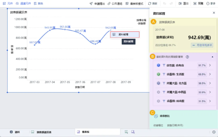 所以在這裡給大家推薦資料視覺化工具。這類工具的優勢就是易於理解,操作更加靈活,對於資料處理和展現更加直觀。數據君比較常用的工具是FineBI,有時候會配合FineReport一起使用。FineReport負責報表製作,FineBI用來做資料整理分析和展示。FineBI除了能解決上述Excel的痛點以外,還提供了智慧資料解釋功能。點選資料點,就能檢視對應的資料分析,使用者可以自定義分析的維度,更快速瞭解資料背後的資訊,輔助事業判斷。