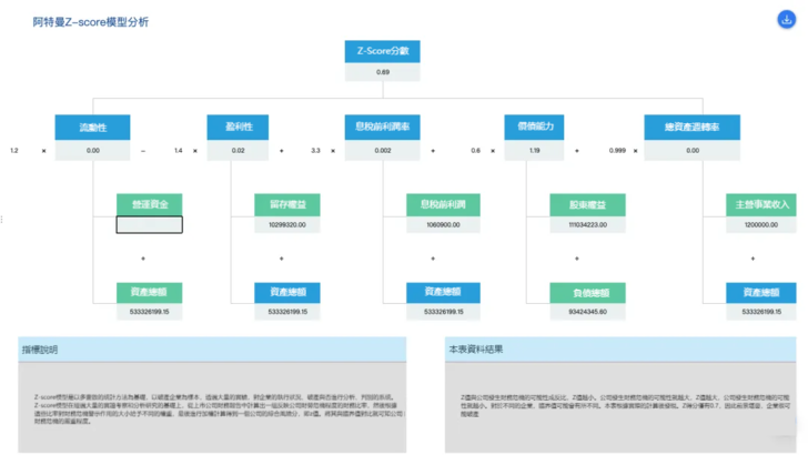 該模型透過一系列精心挑選的財務比率來全方位地考量企業的財務健康狀況。這些比率包括總資產與總負債的比率、營業收入相對於總資產的比率、市值與總負債的比率、淨利潤與總資產的比率,以及現金流量與總負債的比率等。將這些比率整合到一個特定的數學公式中,可以計算出Z-Score值,該值是企業財務狀況的綜合指標。