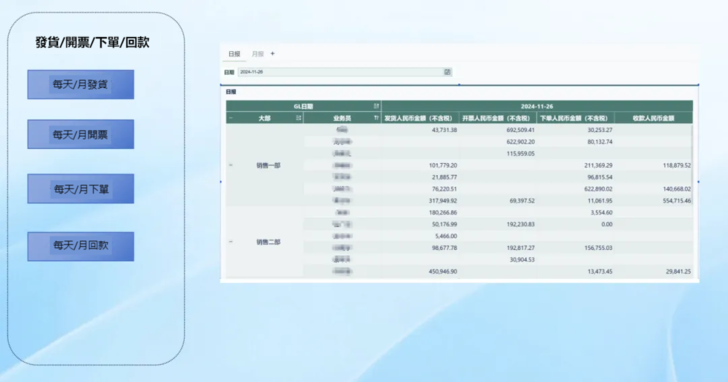 發貨/開票/下單/回款環節,BI工具實時監控執行情況,迅速發現問題並採取糾正措施,優化銷售和財務流程,提高資金週轉效率;