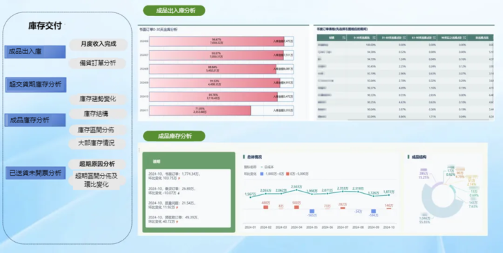 庫存交付方面,BI監控庫存資料,幫助企業分析不同產品庫存水平,預測未來需求,規劃採購和生產計劃,保證按時交付;
