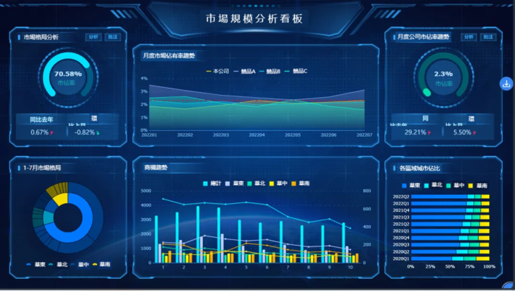 · 市場格局分析:顯示了當前的市場佔有率為70.58%,同比去年增長了0.67%,但環比上月下降了0.82%。這表明公司在市場上的領先地位,但也需要關注近期的下降趨勢。