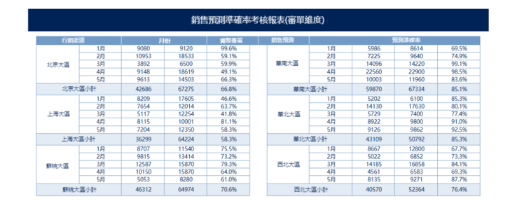 · 報表中列出了北京大區、上海大區、蘇皖大區、華南大區、華北大區和西北大區的銷售預測資料和實際訂單資料。