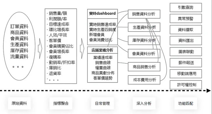 梳理零售事業可發現,在零售行業的資料分析中,商品、門店、庫存、促銷活動和會員管理這五個方面尤為關鍵。分析這些方面的資料,零售企業就能更好地洞悉產品和市場需求,制定更科學的經營策略,提高客戶滿意度與銷售業績。
