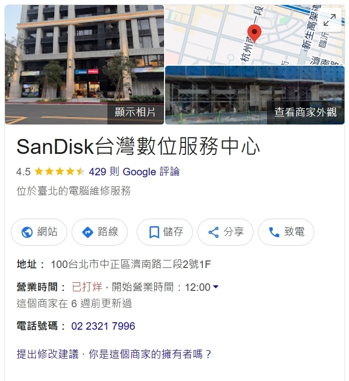 SanDisk售後/快換服務中心從以前在光華八德路82巷3號內,後來搬到八德路一段100號,2024年8月搬到台北市中正區濟南路二段2號1F,請大家不要再跑到舊址了!直接Google搜尋「SanDisk維修站」即會出現SanDisk台灣數位服務中心與正確地址。