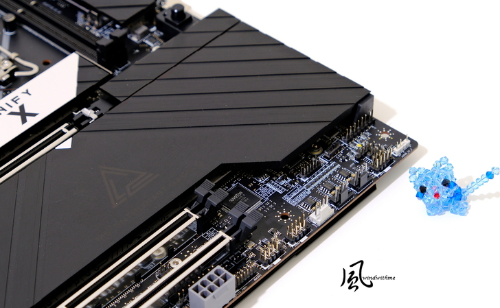 右方有6個SATA3插座與2個前置USB 5Gbps插座、1個USB 20Gbps Type-C,EZ PCIe快拆按鈕拆卸顯示卡。