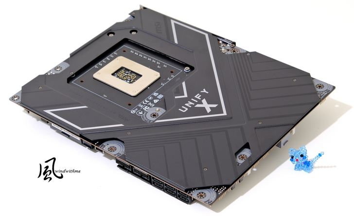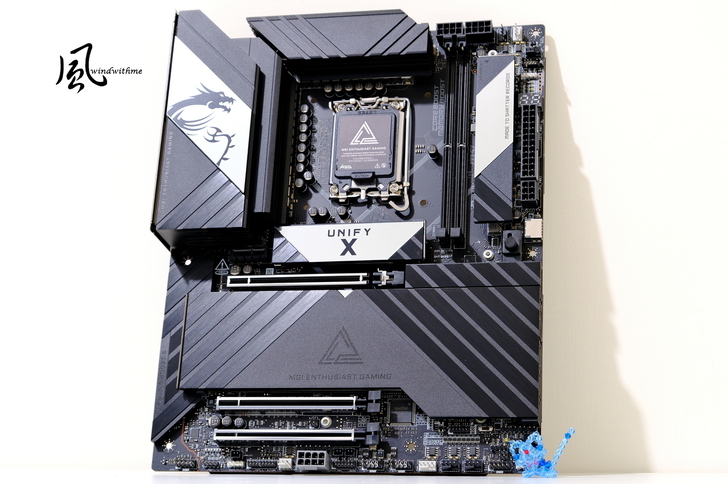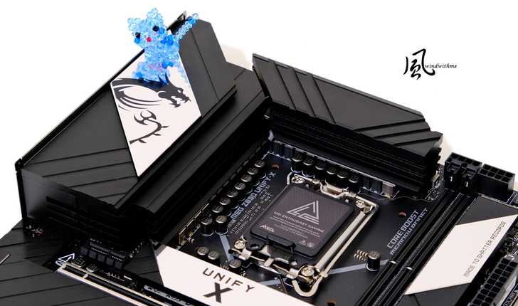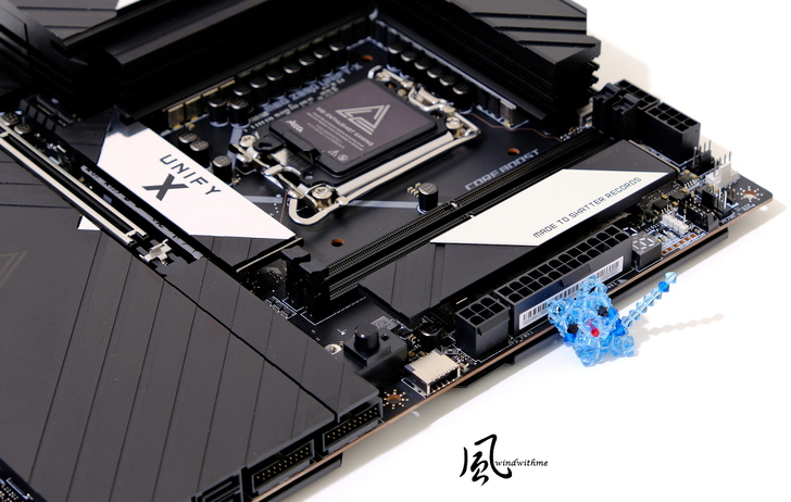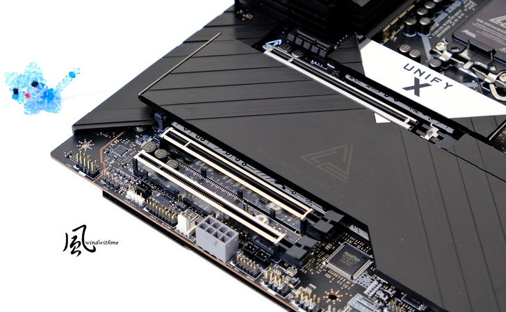 Z890 UNIFY-X全貌,第一眼看到記憶體採用雙DIMM插槽,以往皆是為提升超頻的設計,標榜超頻可達到DDR5 9600+,當然這需要記憶體模組體質夠優秀的前提下。