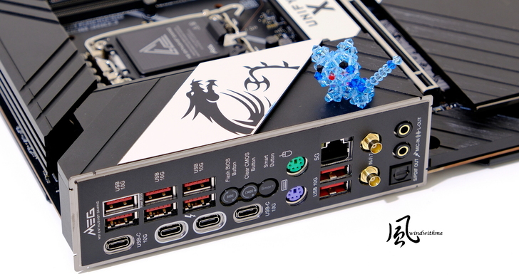 8 x USB 10Gbps Type-A連接埠(紅色)、2 x Thunderbolt 4 USB-C(支援DisplayPort與Daisy-chain)、2 x USB 10Gbps Type-C、Flash BIOS/Clear CMOS/Smart按鈕、PS/2鍵盤滑鼠、RJ45(5Gbps)網路連接埠、2 x Wi-Fi天線接頭、2 x音效接頭、S/PDIF光纖輸出接頭。