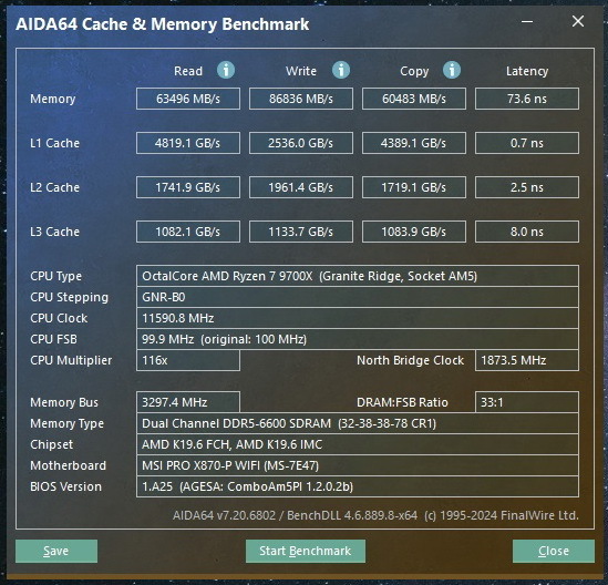 ▼ 使用 AIDA64 記憶體測試 測得 讀取為63496MB/s,寫入為83836MB/s,複製為60483MB/s,延遲為73.6ns。