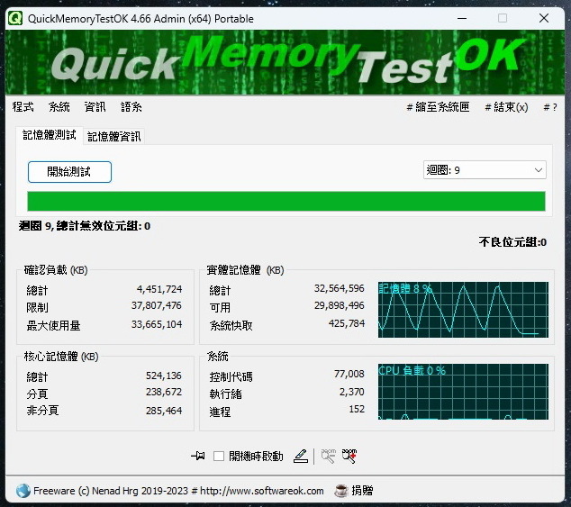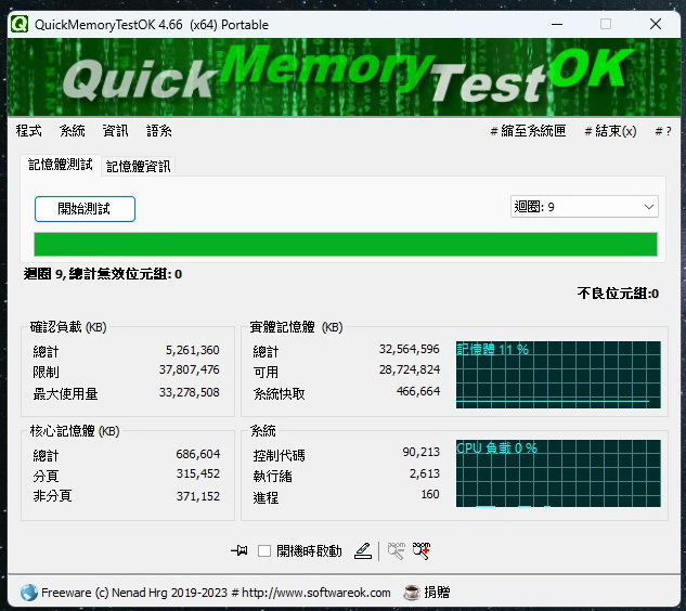 ▼ QuickMemoryTestOK 記憶體檢測工具中,可以看到經過測試後也是完全正常。