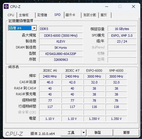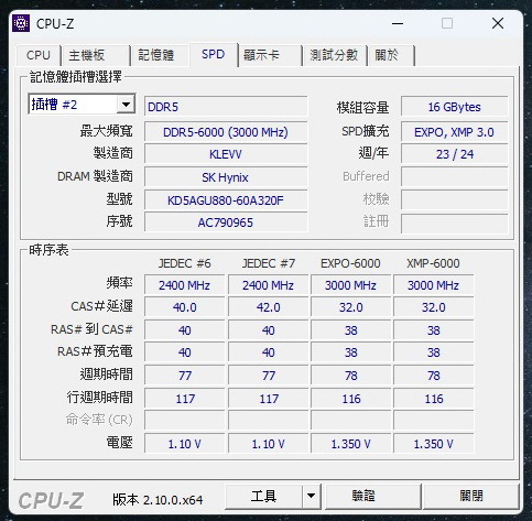 ▼ 使用 CPU-Z 可以看到是採用 Skynix原廠顆粒,6000MT/s 主流時脈為 CL32。
