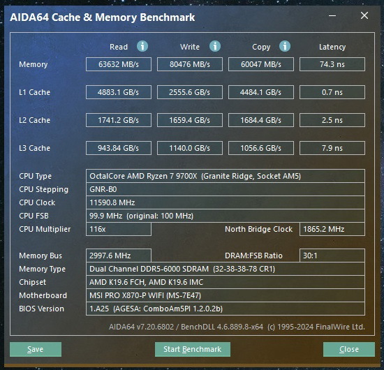▼ 使用 AIDA64 記憶體測試 測得 讀取為63632MB/s,寫入為80476MB/s,複製為60047MB/s,延遲為74.3ns。