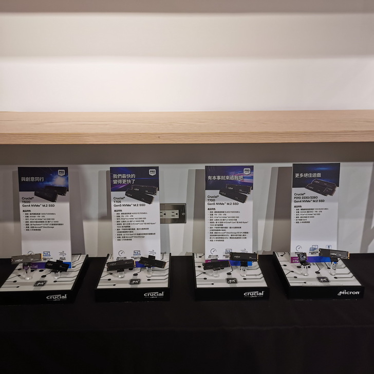 ▼ 活動現場也展示出 美光 Crucial產品,可以看到所有最新的 PCle Gen4、PCle Gen5 SSD,還有 支援Intel XMP3.0跟AMD EXPO 超頻設定檔的 美光 Crucial PRO DDR5-6400超頻版記憶體、美光 Crucial PRO D5 6000記憶體,甚至還有高速行動硬碟 美光 Crucial X9 Pro SSD跟美光Crucial X10 Pro SSD。