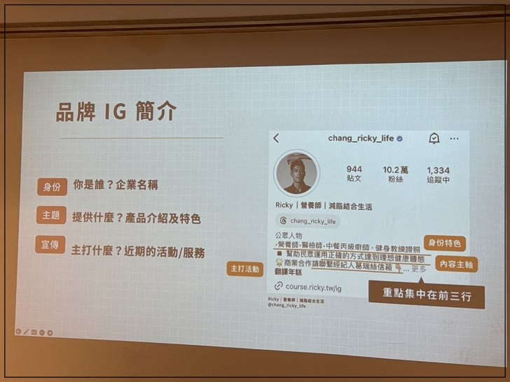品牌IG簡介需要包含身份、主題及宣傳內容,重點要集中在前三行,因為前三行如果無法引起他人興趣,那他就不會點開來看了。
