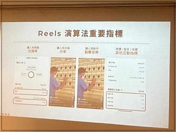 Reels看的是完播率、分享數、點擊音樂,還有其他按讚、留言、收藏的互動指標。