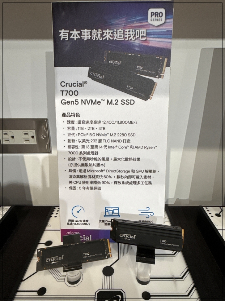 T700比T705稍微慢一點,Gen5 M.2 SSD,循序讀寫12400/11800MB/s,容量有1TB、2TB、4TB。價格當然也比較和善一點。